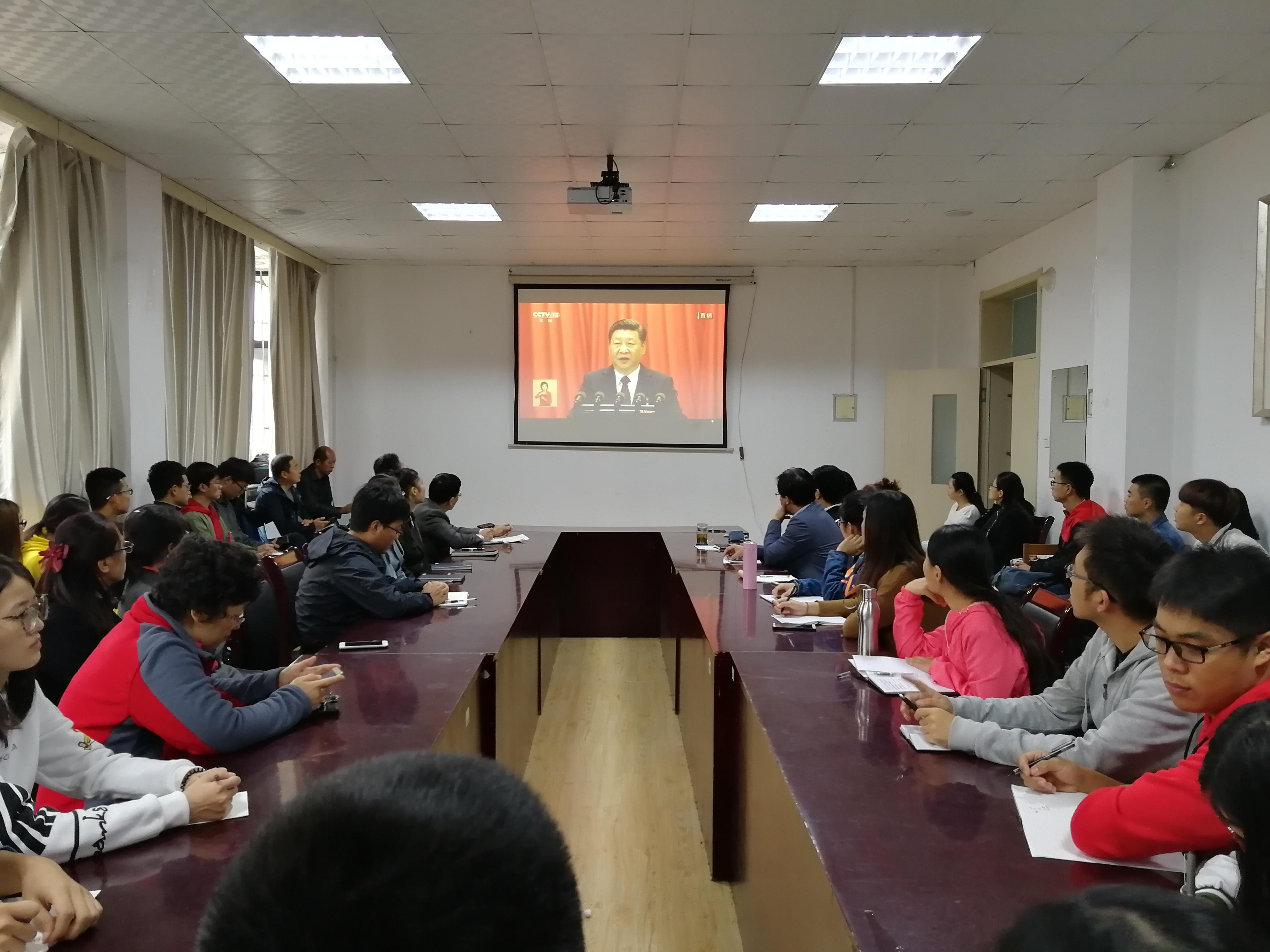 10月18日上午9:00,苏畅av 组织师生党员在慎思楼208会议室集中收看党的十九大开幕盛况。