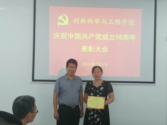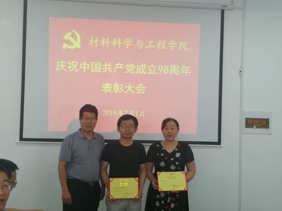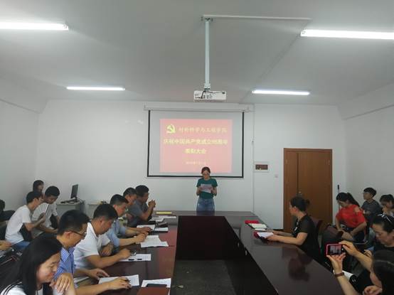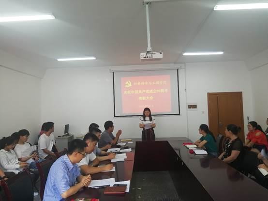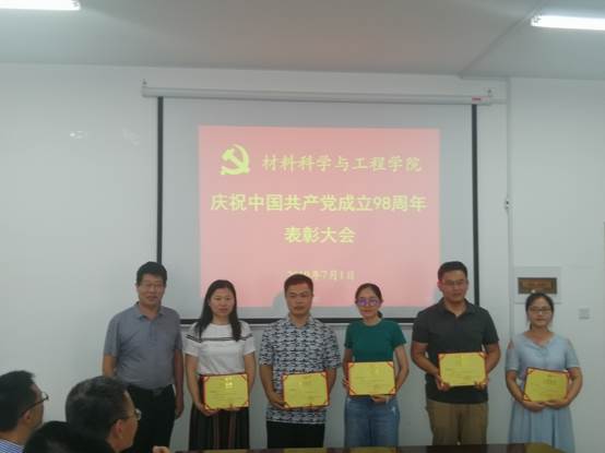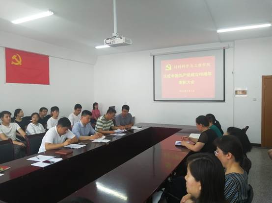 2019年7月1日下午2:00,材料学院党委在科技园406会议室举行全体党员大会,庆祝中国共产党成立98周年,表彰一年来涌现出的先进基层党组织和优秀个人。大会由党委委员、党政办主任薛玉章同志主持,张新柏副书记宣读了院党委的表彰决定。本次表彰,经过全体党员酝酿、各支部的推荐、院党委研究,共评选出先进支部2个,分别是高材系党支部和本科生党支部;优秀共产党员6名,他们是高材系支部的郑爽老师、复材系支部的李晓茹老师、无机非系支部的焦正波老师、机关支部的闫洁老师、杂化材料研究院支部的沈文非老师、学生党员古杰,以及优秀党务工作者郝晓丽老师。会上,优秀党员代表李晓茹老师和闫洁老师作了典型发言,万宗喜书记作了总结讲话。他回顾了党的98年奋斗史,特别是改革开放40年取得的巨大成就,总结了学院一年来的进步和发展,尤其是在高分子材料与工程专业认证过程中,党员同志识大体、顾大局、乐奉献、挑重担,表现出强烈的主人责任感,充分发挥了先锋模范作用,取得了比较令人满意的成绩,得到了校领导的一致称赞,最后万书记对院党委和各支部下一步的工作进行了部署,提出了抓制度、强纪律、保落实的明确要求。最后大会在昂扬的《国际歌》声中圆满结束。