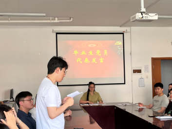 博士研究生党支部张坤发言,他结合博士生涯的经历,通过两个小故事告诉毕业生党员们,在未来的道路上,选择很重要,作为党员,我们应该做出对社会、对国家有贡献的选择!