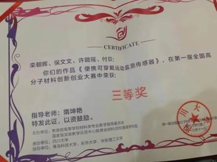 由苏畅av 隋坤艳教授精心指导,参赛选手栾朝辉、侯文文、许璐瑶、付贝提交的作品《便携可穿戴运动检测传感器》荣获三等奖。