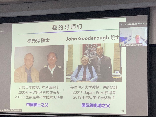 报告中,黄云辉教授结合自己的亲身经历和感受,分享了自己的两位导师,国家最高科技奖获得者、中国稀土之父徐光宪院士和诺贝尔化学奖得主John Goodenough院士的精彩故事。在祖国最需要的时候,徐先生携夫人高小霞院士放弃国外的优渥生活毅然回国报效祖国,徐先生倾其一生矢志创新、科技报国, Goodenough先生则一生淡泊名利、潜心科学,100岁高龄仍坚持工作。两位院士对自己的学生无论在做人还是做事方面都是言传身教,以其高尚的人格和崇高的精神,潜移默化地影响着每一位学生。最后,黄云辉教授耐心回答了与会师生提出的问题,与老师和同学们就个人未来发展等问题进行了交流与探讨,激励青年学子发奋学习,立志成才。