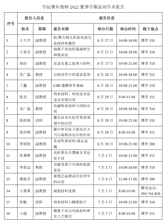 为开拓学生的知识视野,培养学生的科学素养和创新精神,提高学生的综合素质和能力,学院于2022年夏季学期组织学院优秀青年教师为本科生做了系列学术报告,627日至77日,苏畅av 共组织15位青年教师采取线上或线下方式,举办了16场学术报告,报告详细信息见列表。