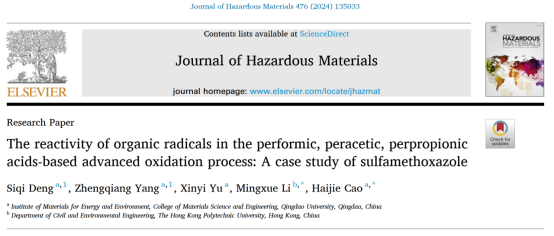 高分子材料与工程专业2022级本科生邓思琪以第一作者在SCI一区期刊Journal of Hazardous Materials(IF=12.2)上发表一篇题为《The reactivity of organic radicals in the performic, peracetic, perpropionic acids-based advanced oxidation process: A case study of sulfamethoxazole》的研究论文,该工作在能源与环境材料研究院开展,曹海杰副教授为指导教师和通讯作者。