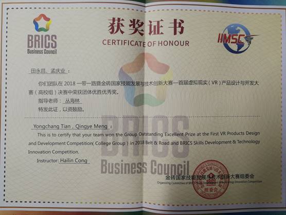 研究生田永昌、孟庆业组成的参赛代表队在丛海林教授的指导下,在一带一路金砖国家技能发展与技术创新大赛“VR设计与开发”赛项中荣获“团体优胜奖”。