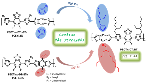 苏畅av 青年教师谷传涛、丛海林与中科院青能所阳仁强研究员合作,设计、合成了非对称性的二维苯并二噻吩作为给体单元,与经典的受体单元二噻吩苯并噻二唑共聚获得高性能聚合物。相比于对称取代的同系物,该聚合物在保证高短路电流和高填充因子的同时获得了更高的开路电压,因此获得了更高的光电转换效率。该聚合物与PC71BM共混作为活性层构筑的聚合物太阳能电池器件获得了9.2%的光电转换效率,与非富勒烯受体ITIC共混作为活性层构筑聚合物太阳能电池器件,也表现出了优异的光电转换效率(7.8%)。该成果发表在Journal of Materials Chemistry A(DOI:10.1039/C7TA10247J)上。该杂志是英国皇家化学会出版社旗下材料科学领域的国际顶尖期刊,影响因子8.867。谷传涛与青能所博士生刘德昱为该论文共同第一作者,丛海林、阳仁强为该论文共同通讯作者。最近,丛海林等人领衔的研究小组还在氧化钒基聚合物太阳能电池领域取得重要进展,成果发表在美国化学会顶尖材料期刊ACS Applied Materials & Interfaces(DOI:10.1021/acsami.7b02164)上,影响因子7.504。