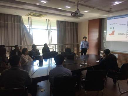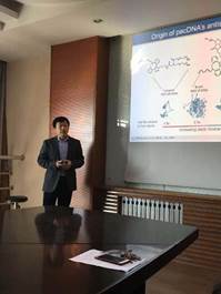 张可教授报告题目为“Making Oligonucleotides Better Biopharmaceuticals with Brush Polymers”,报告讲述了一种新型的短链核酸传递策略,利用聚合物刷的空间阻碍作用可以阻止短链核酸与蛋白质的相互作用,从而减少短链核酸在治疗中的负面影响。此次报告给在座的师生有很大的启发,引发了热烈的讨论。