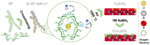 基于上述科学问题,团队报道了一种新型Li+导体—基于海藻纤维模板的氧空位锆酸锂(O-LZO),用于聚环氧乙烷(PEO)基固态电解质(PEO@O-LZO),旨在实现CPE中Li+浓度和界面性能的提升。O-LZO表现出优异的本征Li+传输能力,并且其表面氧空位能够实现对锂盐阴离子得有效吸附以促进锂盐的解离,从而提升CPE中游离Li+的浓度,以此实现高效的Li+传输。同时得益于氧空位的正电性平衡电荷层,避免了Li+受填料极性影响而导致的聚集,平衡了Li+的分布,以此实现稳定的界面同时促进了Li+的稳定传输。本工作提供了一种填料的设计原理,用于调节CPE中Li+的浓度和分布,以实现高效固态锂金属电池。
