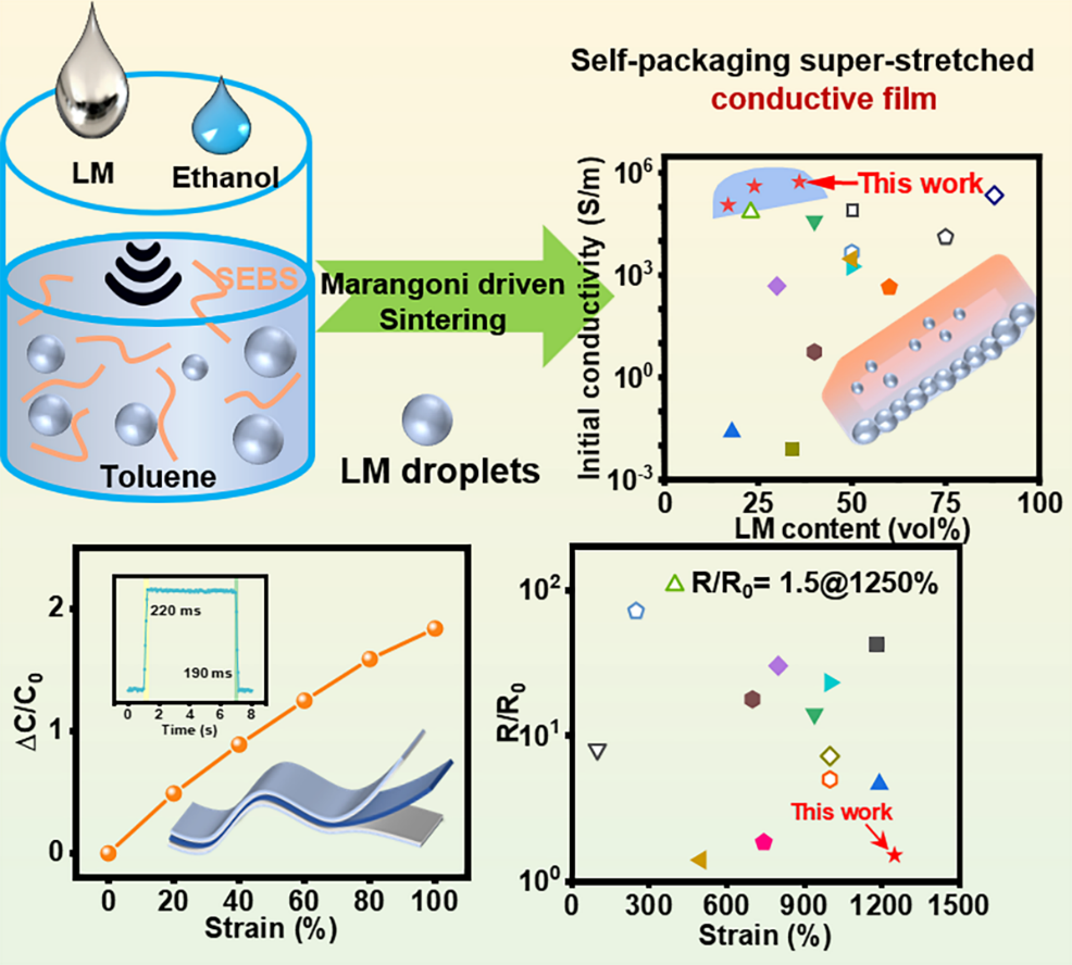 研究人员提出了一种马兰戈尼驱动的自烧结方法制备可拉伸电子器件,利用快速非溶剂挥发诱导的马兰戈尼效应形成梯度液滴沉降,在无任何后活化过程的情况下提高液态金属液滴的烧结力,制备的弹性薄膜在低液态金属含量下展现出优异的导电性,还实现了卓越的应变不敏感电学行为,该界面力调控的自烧结策略为开发液态金属基柔性电子器件提供了新范式!。