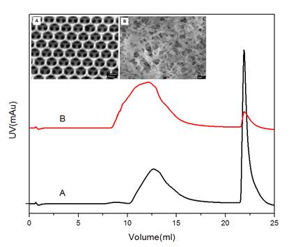 图9 研究院所构建的ICC膜色谱材料(A)和商业化的PVDF膜色谱材料(B)的SEM照片及其在抗体IgG4装载、洗涤和洗脱过程中紫外吸收与体积流量的变化: ICC膜对IgG4的结合容量是商业化PVDF膜的 10.2 倍