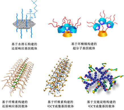 研究院已经成功制备了多种高性能基因载体材料,如图2所示。研究院通过原子转移自由基聚合(ATRP)在片层状水滑石纳米颗粒和针状纤维素纳米晶表面制备了双硫键(-SS-)连接的阳离子聚合物链聚甲基丙烯酸-N,N-二甲氨基乙酯(PDMAEMA),构建了具有还原响应性的基因载体(Bioconjug. Chem., 2013, 24,968; ACS Appl. Mater. Interfaces, 2015, 7, 8942-51。研究发现纤维素纳米晶的针状形貌可以显著促进细胞对载体的摄取,因此研究院进一步在纤维素纳米晶表面引入了具有生物相容性的聚(乙二醇)乙醚甲基丙烯酸酯(PEGEEMA)聚合物链,并负载金纳米颗粒(Au NPs),制备了一种低毒高效且具备CT造影功能的基因载体(Polym. Chem., 2016, 7, 3107),为实现基因治疗中的诊疗一体化提供了一个理论模型。研究院也基于多糖(包括环糊精、支链淀粉)制得了系列多糖基基因载体;探究了不同结构环糊精-金刚烷主客体自组装超分子作为基因载体对转染效率的影响(Sci. China: Chem., 2015, 58, 1461; Polym. Chem., 2015, 6, 2466)。另外,研究院基于介孔二氧化硅、金纳米颗粒、聚甲基丙烯酸缩水甘油酯(PGMA)等材料制备了系列高性能、多功能基因载体(Acta Biomater., 2014, 10, 3786; ACS Appl. Mater. Interfaces, 2014, 6, 17911; Acta Biomater., 2015, 11, 381; ACS Appl. Mater. Interfaces, 2015, 7, 553; ACS Appl. Mater. Interfaces, 2015, 7, 12238; ACS Appl. Mater. Interfaces, 2016, 6, 1044; ACS Appl. Mater. Interfaces, 2016, 8, 8376; Bioconjug. Chem., 2016, 27, 2744; ACS Appl. Mater. Interfaces, 2016, 8, 3919; Biomater. Sci., 2016, 4, 1233;Biomaterials, 2017,117, 77)。