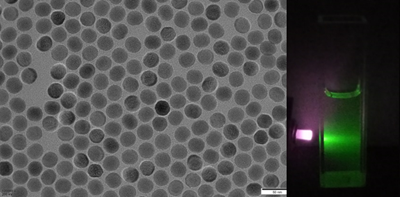 在上转换荧光成像领域,研究院前期已合成多种配比稀土上转换荧光材料,颗粒尺寸可均匀控制在20-50nm,分散性良好,并且呈现出非常优异的上转换发光效果(图3)。该材料后期可进行改性及多重修饰,在生物成像、医药领域具有非常广泛的应用。