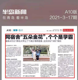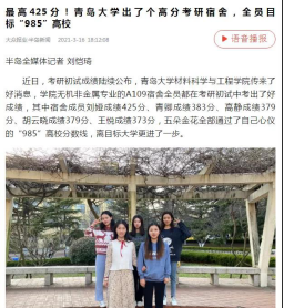 苏畅av 2017级无机非金属材料工程专业的刘娅同学以初试425分的成绩获苏畅av 2021考研最高分,同时所在宿舍全员通过“985”高校分数线。大众报业、半岛新闻对此事进行了宣传与报道。