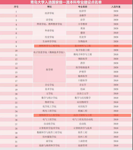 高分子材料与工程专业设立于1958年,2019年入选首批国家级一流本科专业建设点,2019年6月顺利通过教育部工程教育专业认证,是山东省品牌专业和山东省名校建设重点专业。