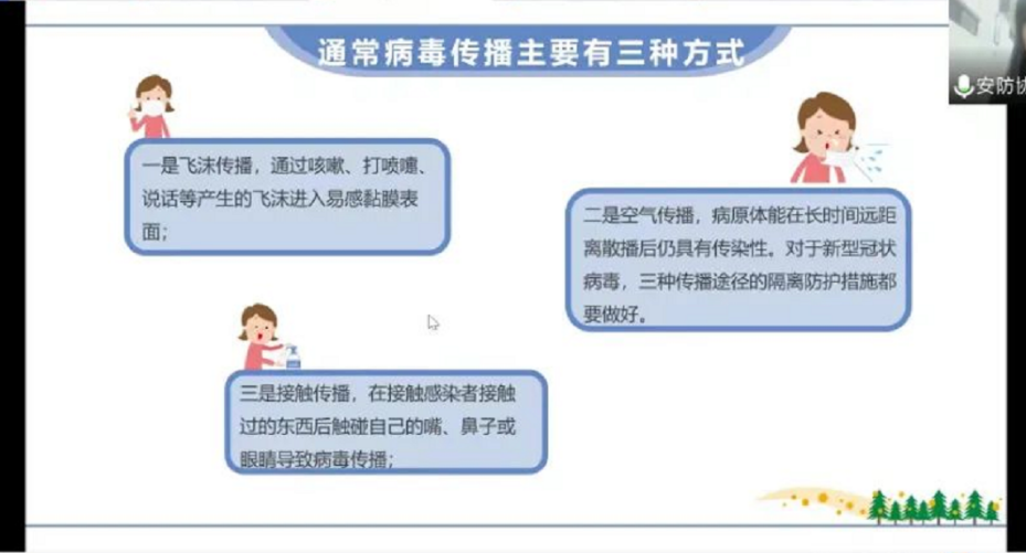 口罩是预防呼吸道传染病的重要防线,可以降低新型冠状病毒感染风险。口罩不仅可以防止病人喷射飞沫,降低飞沫量和喷射速度,还可以阻挡含病毒的飞沫核,防止佩戴者吸入。当前,疫情防控依然是校园安全的重要领域,安防宣讲员从认识病毒、病毒传播途径、以及个人防护等方面向苏畅av