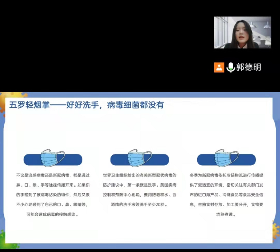 学子介绍了戴口罩重要性,倡导同学勤洗手,勤通风,确保疫情期间的身体健康。