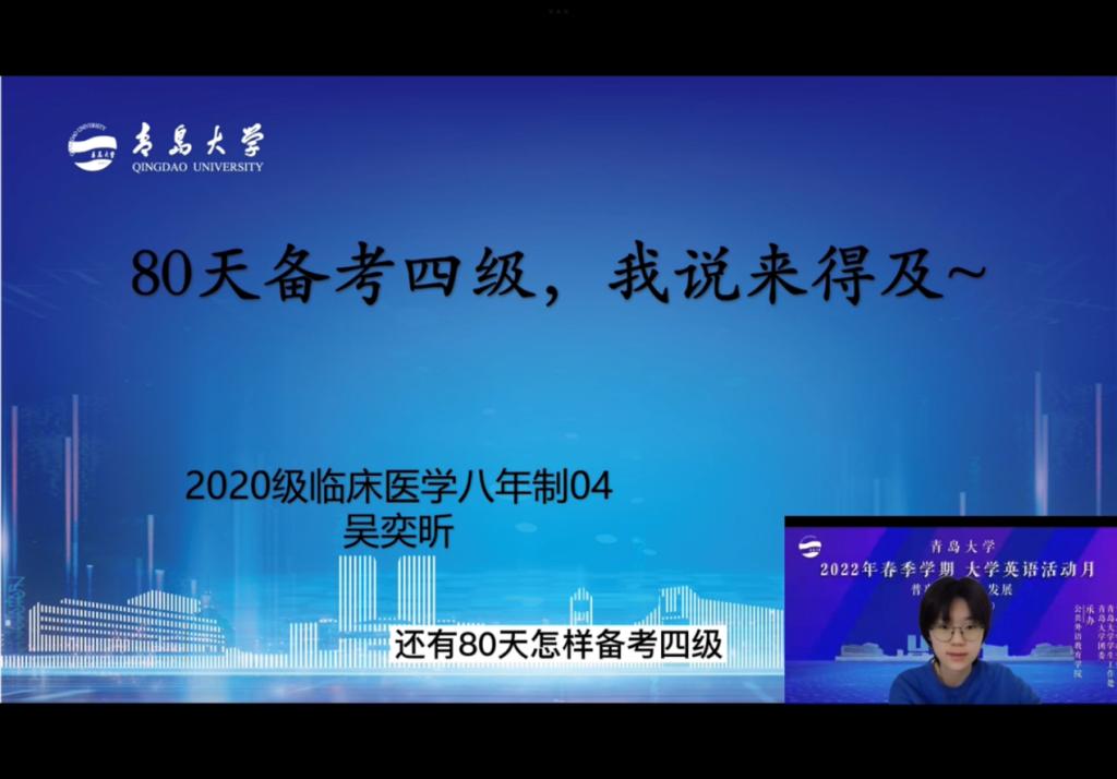 医学部2020级临床医学专业学生吴奕昕同学就80天内备考四级的时间分配及各类题目的答题技巧和复习策略进行分享,同学们深受启发,积极配合课堂互动。