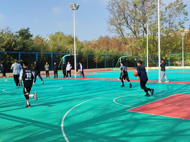 一声哨响,两支球队开始了球赛。教师队率先稳稳的中投拿下两分,学生队也展开联防,紧张刺激的气氛一点即燃。双方队员愈战愈勇,打出默契配合,团队精神彰显淋漓,比赛场面焦灼热烈。第一场比赛结束,教师队凭借默契配合的优势以51:41取得的胜利。