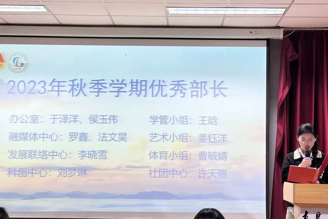 学生会主席为“优秀部长”颁发荣誉证书并合影留念。