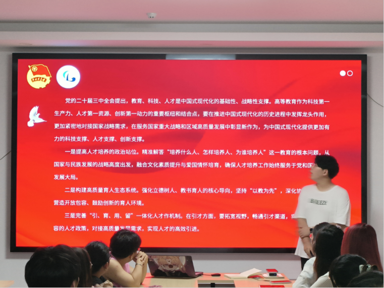 会议第二部分,学生会主席法文昊带领学生会学生干部进行政治理论学习。法文昊部署了学生会2024年秋季学期主题教育学习计划,并领学党的二十届三中全会精神,重点学习了教育、科技、文化等方面的相关内容。
