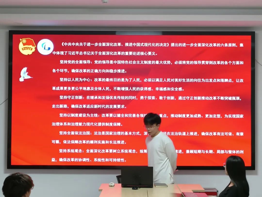 会议第二部分,学生会主席廖添旭带领学生会学生干部进行政治理论学习。廖添旭带领学生会学生干部学习了《中共中央关于进一步全面深化改革、推进中国式现代化的决定》提出的进一步全面深化改革的六条原则。这六条原则不仅是国家发展的战略指引,更是激励青年学生勇于担当、奋发有为的行动纲领。我们要将学习成果内化于心、外化于行,以实际行动践行青春誓言,为实现中华民族伟大复兴的中国梦而不懈奋斗!