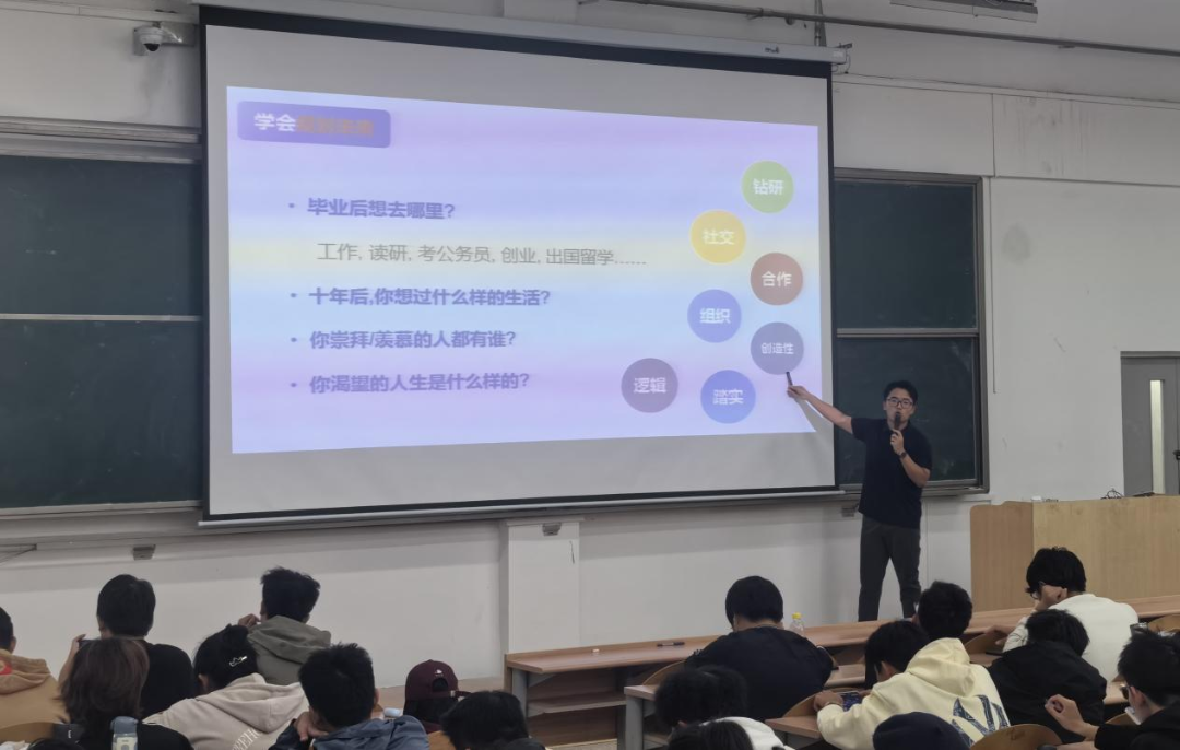 首先李明栋老师以知名演员的转型为例,引导新生探讨如何适应由高中生向大学生身份的转换,他指出,新生将面临生活环境陌生、人际关系重建和自我心态冲突等挑战。