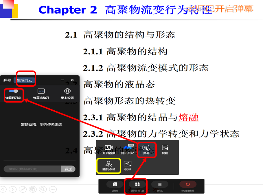 弹幕: 教师提问问题,点击“课堂互动”- 开启“弹幕”