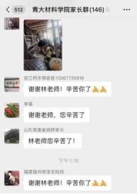 青岛发生疫情,牵动着学院1300多个学生家庭的心,各年级辅导员通过家长群,实时直播学生在校的各类动态,让家长更直观全面地了解学生在校期间的生活学习情况,同时在学院官微“QDU材料”发布《携手战疫,我们在一起——致全体学生和家长的一封信》,帮助家长了解疫情形势和学校疫情防控工作,深化家校联动,请家长放心,并支持配合学校疫情防控工作,不仅做到“屏”对“屏”,“键”对“键”,更做到“心”贴“心”,“情”连“情”。