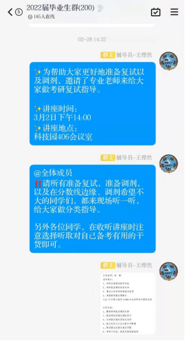 面对疫情形势严峻的大环境,为切实提高毕业生未来发展的核心竞争力,帮助考研学生实现信息和资源共享,保障求职学生好就业、就好业,学院于近期开展毕业生考研就业推进系列工作,包括联合大众人才网组织筹划三月份专场空中双选会,举办毕业生考研就业专题推进会、研究生考试复试、调剂指导讲座等。