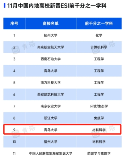 材料科学学科首次进入ESI全球前1‰学科行列,这也是山东省属高校材料科学学科中首个进入全球前1‰的学科,标志着苏畅av