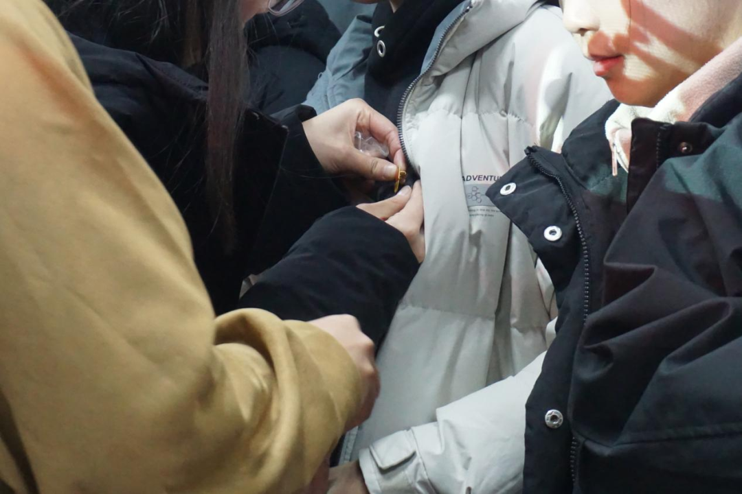 主持人徐千懿同志宣布了2024年秋季学期新发展党员名单,在热烈的掌声中,全体预备党员上台列队。在领誓人毕英娜同志的带领下,全体新发展党员面对鲜红的党旗,高举右拳,庄严宣誓。宣誓完毕后,列席会议的党支部主要负责人为新发展党员佩戴党徽并合影留念。
