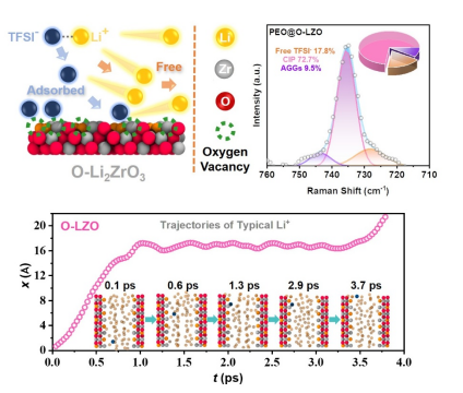 基于上述科学问题,团队报道了一种新型Li+导体—基于海藻纤维模板的氧空位锆酸锂(O-LZO),用于聚环氧乙烷(PEO)基固态电解质(PEO@O-LZO),旨在实现CPE中Li+浓度和界面性能的提升。O-LZO表现出优异的本征Li+传输能力,并且其表面氧空位能够实现对锂盐阴离子得有效吸附以促进锂盐的解离,从而提升CPE中游离Li+的浓度,以此实现高效的Li+传输。同时得益于氧空位的正电性平衡电荷层,避免了Li+受填料极性影响而导致的聚集,平衡了Li+的分布,以此实现稳定的界面同时促进了Li+的稳定传输。本工作提供了一种填料的设计原理,用于调节CPE中Li+的浓度和分布,以实现高效固态锂金属电池。