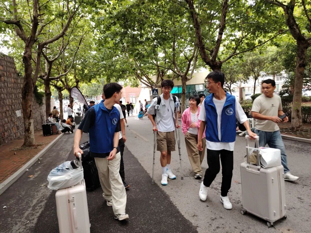当天,迎新志愿者队伍一大早便在迎新报到处等待新生的到来。在金家岭校区,学院为2025级本科新生打造充满创意与温情的迎新体验。从踏入校门起,由学院学生会和先锋学社学生组成“专属引路员”提供全程陪伴——搬行李、找宿舍、解疑惑,贴心服务堪比“人文导航”。