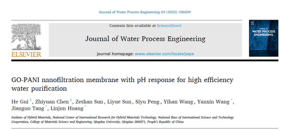 近日,学院本科生桂河(2023级先进材料创新实验班)与陈知远(2023级高分子材料创新班)作为共同一作,在石墨烯基杂化纳滤膜研究领域取得新进展,研究成果以“GO-PANI nanofiltration membrane with pH response for high efficiency water purification”为题发表在国际期刊《Journal of Water Process Engineering》上(//doi.org/10.1016/j.jwpe.2024.106889),该期刊为SCI收录期刊(中国科学院二区Top, JCR分区位于Q1, IF 2023=6.3)。指导教师和论文通讯作者为黄林军教授和唐建国教授,苏畅av 为唯一完成和通讯单位。
