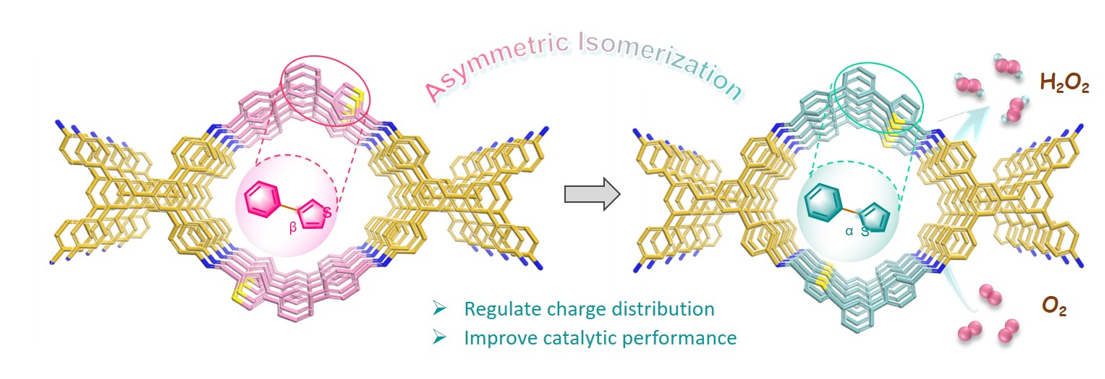 基于这一科学问题,该同学实施了一种创新的不对称异构化策略,从而有效调节二电子ORR中催化剂的电子态。具体在COFs结构中分别引入不同取代位置的噻吩异构体单元,成功开发出两种不对称异构的新型电催化剂。不对称异构策略可以精确调节中间体的吸附能力和电子态,使其具有可控的化学活性和优异的二电子氧还原电催化性能。
